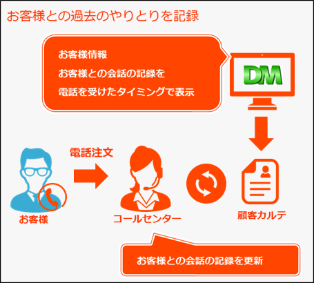 お客様との過去のやりとりを記録 お客様とのやりとりを記録することによって、次回同じお客様からお電話で注文を頂いた際の一歩進んだ対応が可能に。 お客様に特別感を持っていただく対応ができます。 |