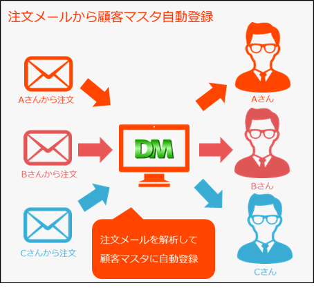 DMショップには、注文メールから新規のお客様であれば入力の手間なく顧客マスタへの自動登録が可能です。