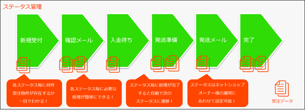 ステータス管理をすることによって、業務の効率化、あってはならない、お客様への発送抜けや漏れ等の