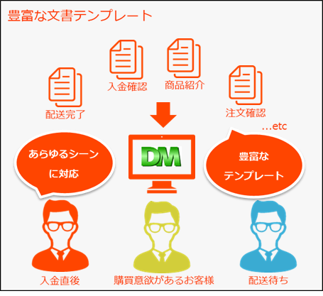 DMショップでは、様々な文書テンプレートをご用意しております。 たくさんのお客様に対してメールを個別に作成する必要がなく、お客様毎の注文内容をメールの中に自動反映し返信が可能です。 また、到着確認メールなど、定期的に送るメールも事前に送付日の指定が可能です。メールの送付忘れ防止になります。 |