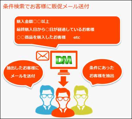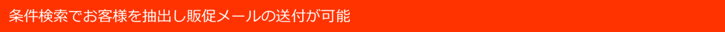 購入金額が○○円未満や、指定商品を購入したお客様など、条件検索でお客様を抽出し、販促メールを一括で送信することができます。 |