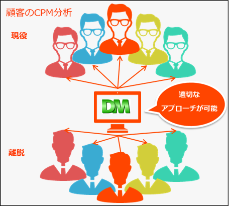 お客様をグルーピングしアプローチしていく手法です。 CPM分析を活用することで、売上を上げるためのアプローチを適切なグループに行えます。新規のお客様のリピーター化や離脱したお客様を戻すアプローチが効果的に行えます。 |