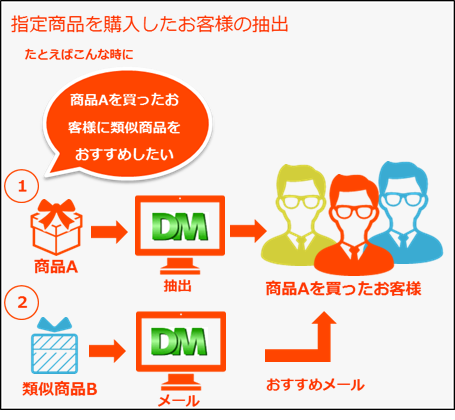 商品起点で該当商品を買っていただいたお客様を抽出することができます。 関連商品をおすすめしたり、消耗品であれば、同一商品を再度おすすめすることによって、効果的な販促が期待できます。 抽出したお客様に一括でセールスメールを送付することも可能です。 |
