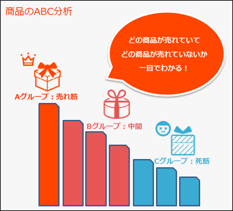 商品をAグループ、Bグループ、Cグループと3つのグループに分け、商品売れ筋、死に筋を確認することができます。 売れ筋商品の在庫数が少なく機会損失をしているケースや、死に筋商品の在庫数が多く、余剰在庫になっているケースなどが確認できます。 |